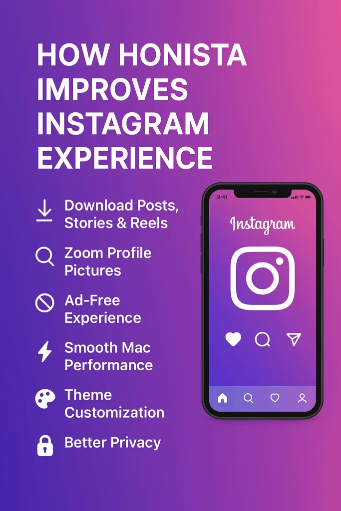 Honista improves Instagram by giving users more control and freedom. It lets you download posts, stories, and reels directly. You can also zoom in on profile pictures, which is not possible in the normal app. These small changes make using Instagram more fun and useful.It also removes ads and adds smooth performance on Mac. Users can enjoy scrolling without interruptions and customize themes to match their style. With better privacy and extra tools, Honista makes Instagram more personal and enjoyable for everyone.