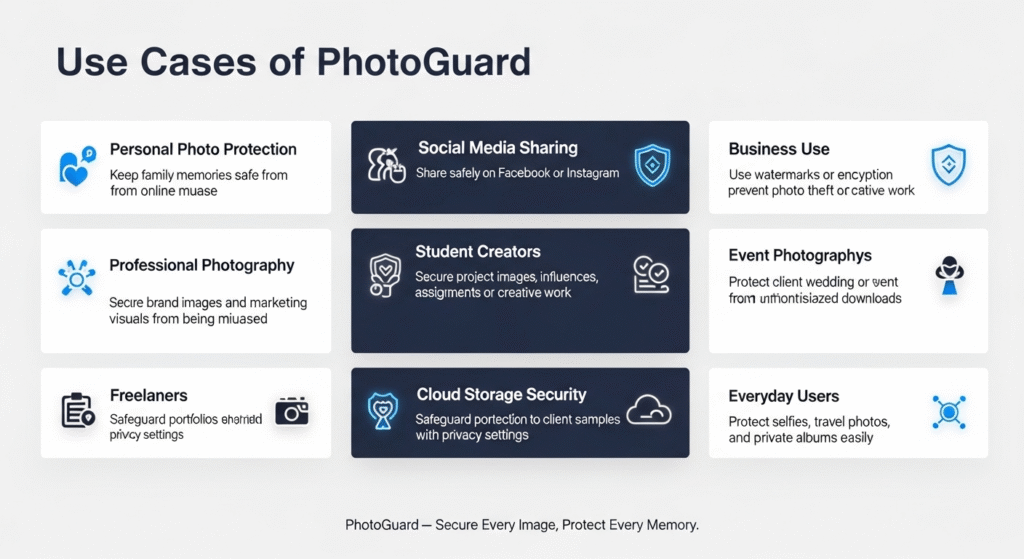 The privacy tool is more than just a photo app. It keeps your pictures safe, private, and under your control. With features like encryption, watermarks, and privacy tools, it makes sure your memories and work stay protected.Many people worry about their photos being stolen or misused online. PhotoGuard gives you peace of mind with simple tools that anyone can use. It is reliable, fast, and a smart choice for both personal and professional needs.